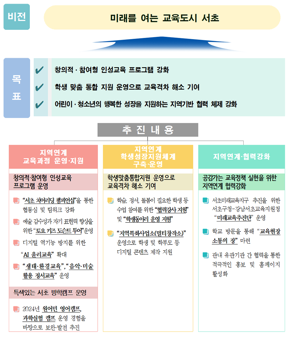 서울시교육청, 서초구청, 강남서초교육지원청, 지역사회, 학교 등이 협력하여 지역자원을 활용한 다양한 학습경험을 제공하여 어린이 · 청소년이 미래역량을 함양할 수 있도록 지역연계 교육과정을 운영하는 교육협력사업