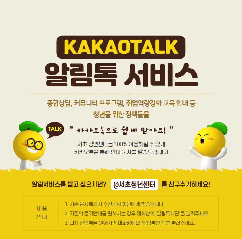 서초 청년센터를 100% 이용하실 수 있게 카카오톡을 통해 안내 문자를 발송드립니다!