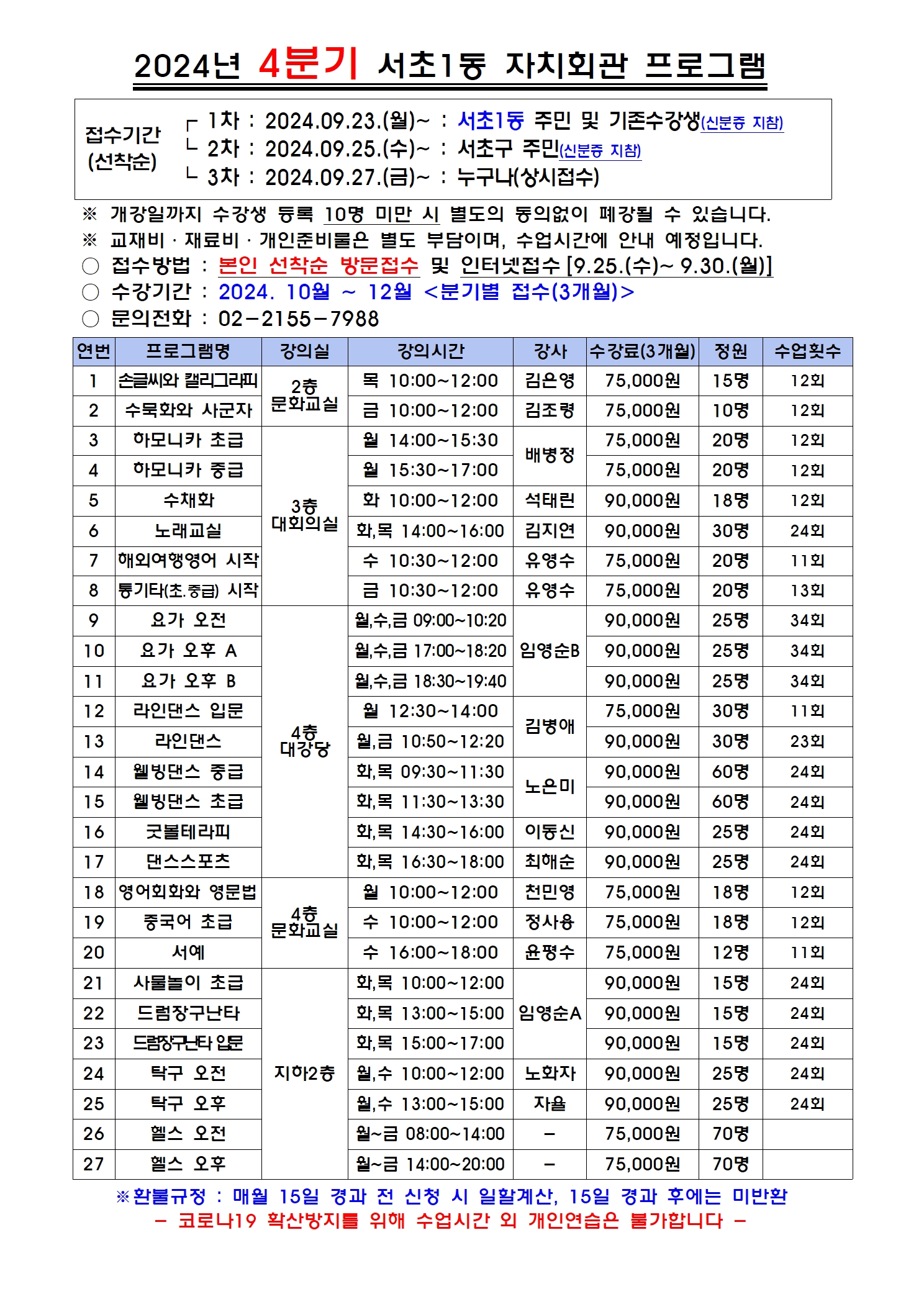 문의전화 : 서초1동 자치회관 02-2155-7988