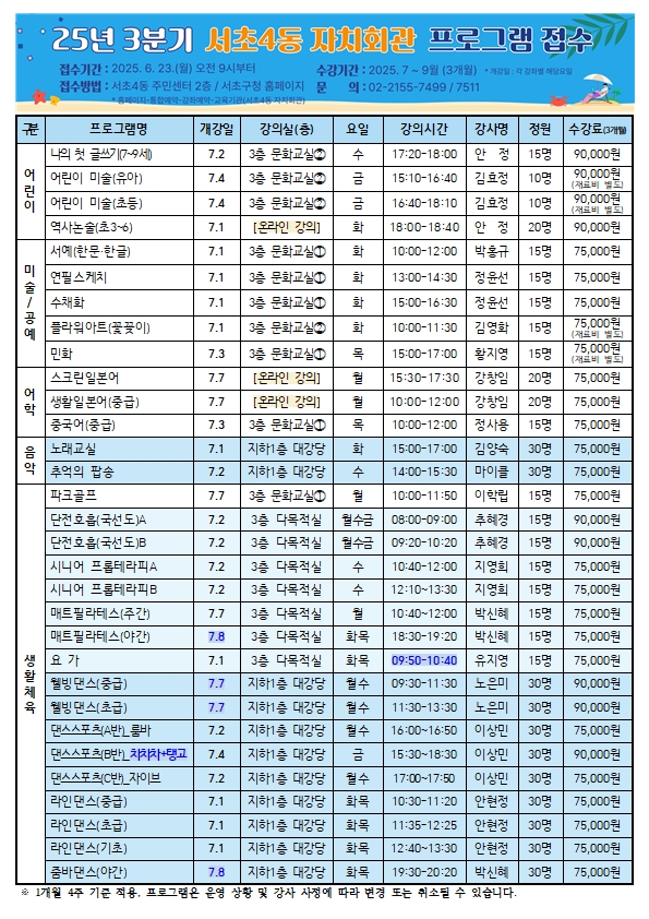 3. 강좌 폐강 : 프로그램별 최소 수강 인원 미만일 경우 폐강될 수 있습니다.