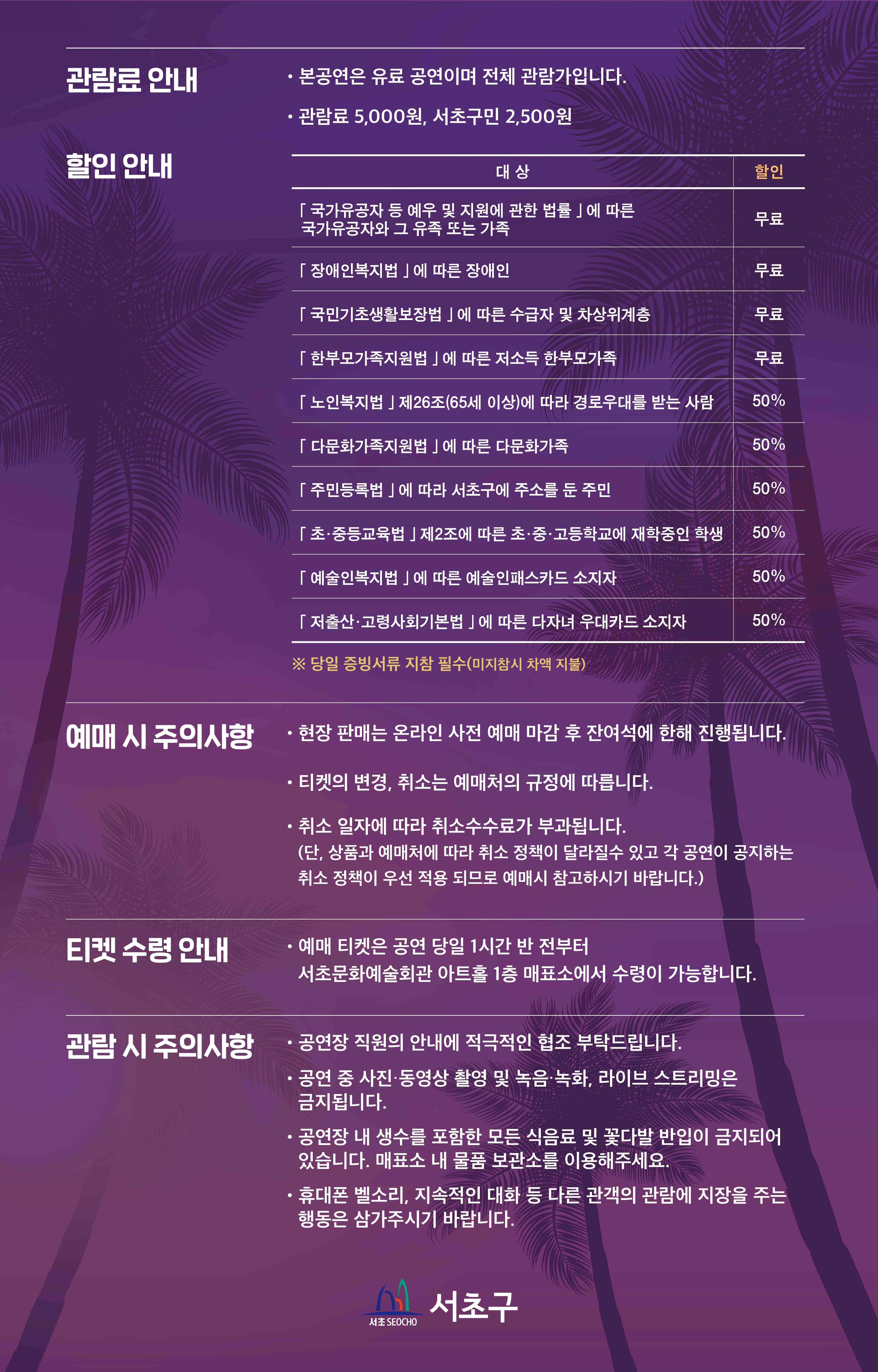 ※ 예매취소는 '마이서초 → 나의예약 → 행사예약확인 → 금요음악회 신청 내역'에서 취소 가능합니다.