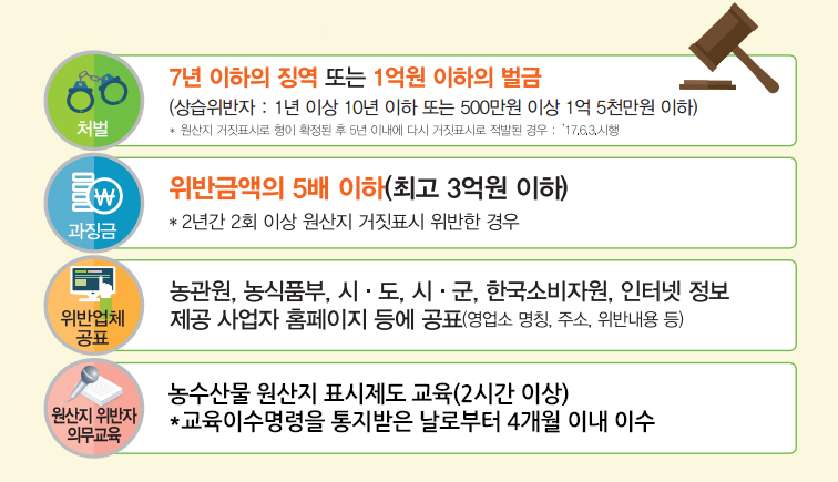- 처벌 : 7년 이하의 징역 또는 1억원 이하의 벌금 (상습위반자 : 1년 이상 10년 이하 또는 500만원 이상 1억 5천만원 이하) *원산지 거짓표시로 형이 확정된 후 5년 이내에 다시 거짓표시로 적발된 경우 : '17.6.3. 시행