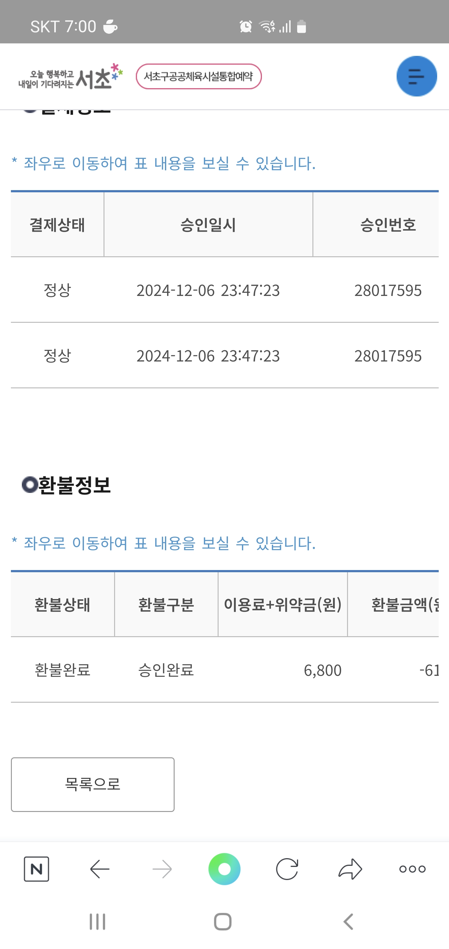 반포종합운동장 환불관련 문의 드립니다 작성자 이효원 작성일 2024년 12월 14일 19시 3분 24초 조회 405 Screenshot_20241214_190012_NAVER.jpg [ Size : 364.2KB , Down : 128 ] 미리보기 다운로드 안녕하세요 반포종합운동장 축구장을 대관하였다가 환불했는데 계좌에 돈이 들어오지 않아 문의 드립니다. 12월 12일 13:00~15:00 에 이효원으로 대관신청을 하였습니다 목록보기